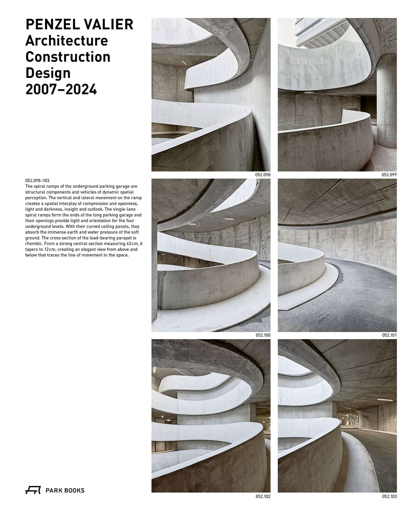 本書は、チューリッヒを拠点とする建築・構造エンジニアリング事務所Penzel Valierの初の本格的モノグラフです。2008年に建築家Christian Penzelと構造エンジニアMartin Valierが設立し、建築と構造の緊密な相互作用を設計の核として、多様なスケールと用途のプロジェクトを展開してきました。交通・インフラ、オフィス、スポーツ施設、住宅、インテリア、プロダクトまで領域横断的に扱い、計画思想を構造的合理性と空間体験の両面から組み立てていく点が特徴です。未発表写真やビジュアライゼーション、図面、トリメトリック(等角投影)図などを多用し、設計と構築の関係を可視化します。