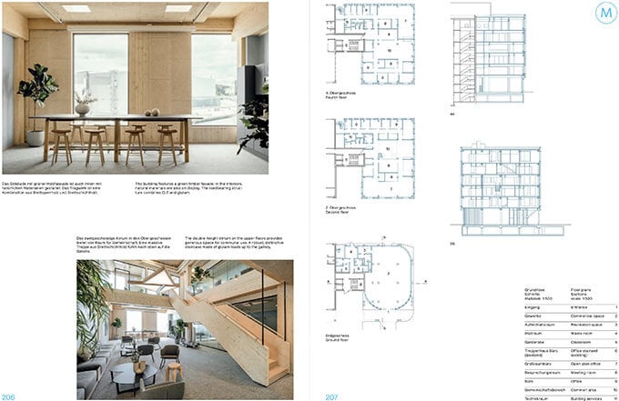 無垢材構造、モジュール工法、フレーム構造、スケルトン構造、ハイブリッド構造など、さまざまな構法を図面やディテール図とともに解説。各プロジェクトは設計から施工に至るまでの具体的なアプローチを示し、木材を用いた建築の技術的および環境的な側面を概観できる内容となっている。