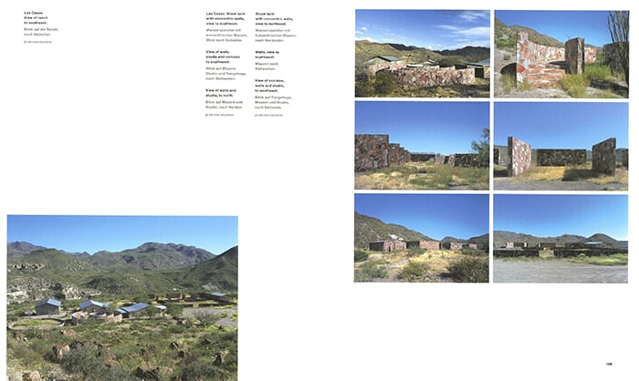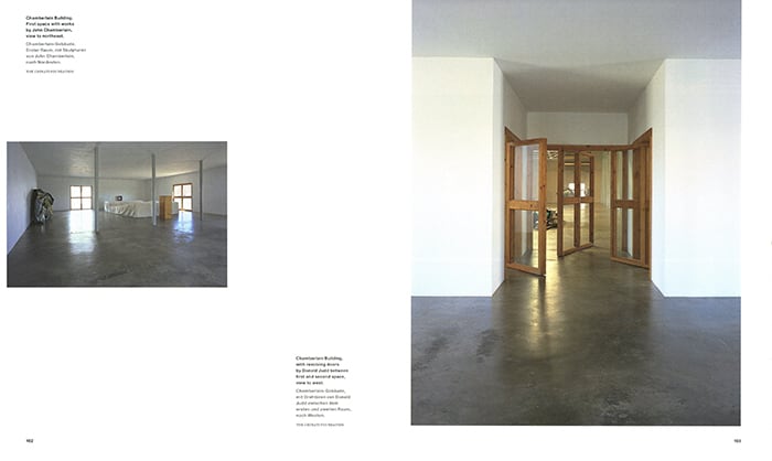 舞台となるのは、旧軍事基地フォートD.R.ラッセルを含む広大な敷地。ジャッドはこの場所を取得し、複数の建物群を段階的に改修・再構成することで、アートと建築が連続する環境を形成しました。本書では、アーティラリー・シェッドやチナティ関連施設など、主要な建築群を図面とともに詳細に記録しています。